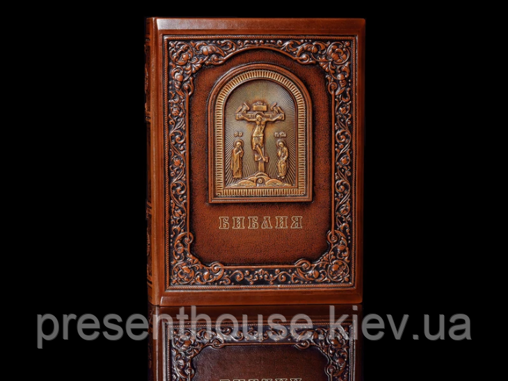 Обкладинка ручної роботи з натуральної шкіри. Конгревне тиснення (барельєф на шкірі) біблійних сюжетів і тиснення позолоченою фольгою. Тонування шкіри.